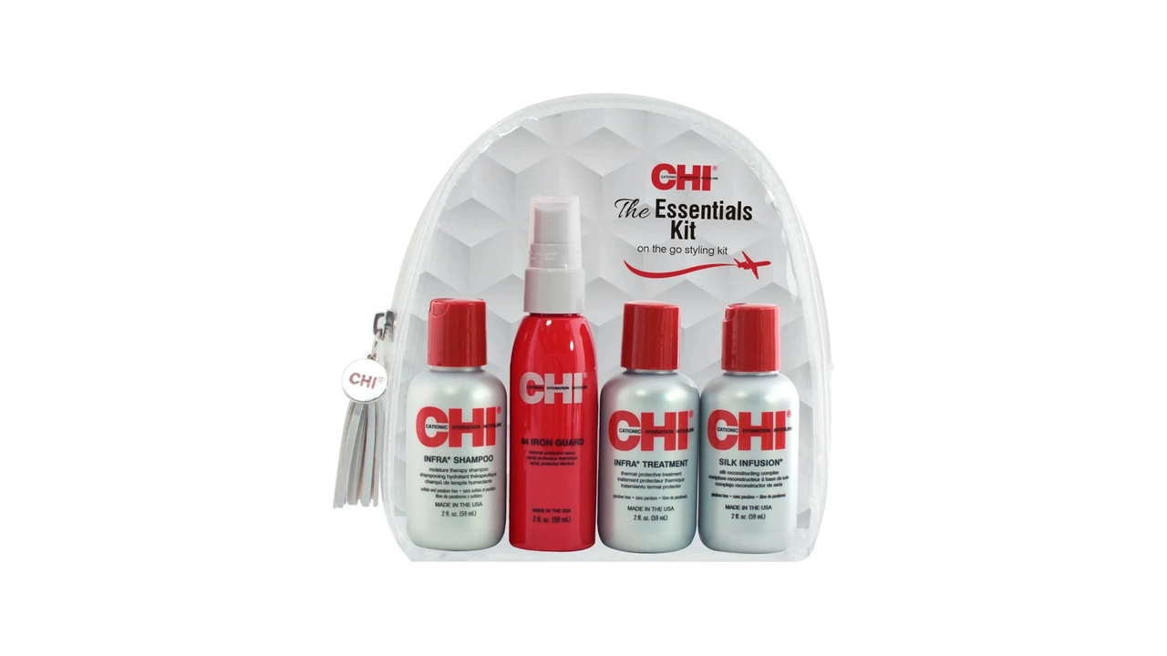 A travel‑ready selection of four professional hair care essentials from the CHI Infra line formulated to cleanse, condition, repair, moisturize, and protect hair during daily use or while on the go. The kit brings together signature CHI technology for hydration and strength in convenient mini sizes, ideal for testing or short trips.