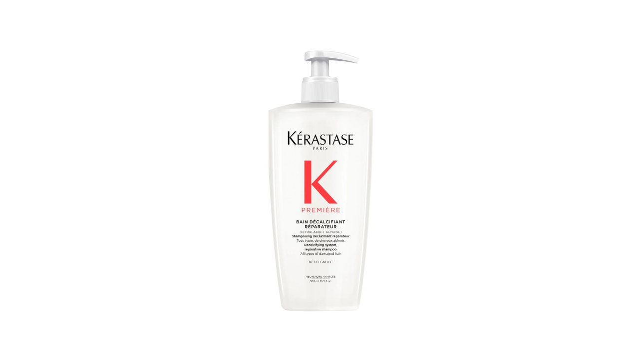 Kérastase Première Bain Décalcifiant Réparateur is a decalcifying, repairing shampoo for all damaged or over-processed hair. This sulfate-free formula gently removes calcium buildup from hard water, strengthens hair from within, and reduces breakage. Its creamy texture transforms into a rich foam, restoring smoothness, shine, and bounce while repairing keratin links. For best results, layer with Kérastase Concentré Décalcifiant Ultra-Réparateur or use with other Première range treatments like Masque Filler Réparateur.