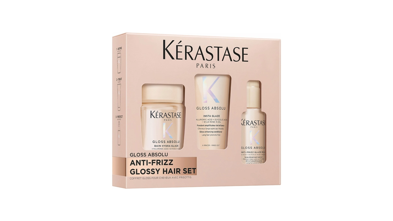 Travel-friendly set from Kérastase Gloss Absolu, designed to smooth, hydrate, and boost shine for frizz-prone hair. Enriched with hyaluronic acid, glycolic acid, and wild rose oil, the trio cleanses gently, conditions deeply, and protects hair from humidity and heat. Perfect for travel or trying the range, it leaves hair soft, glossy, and manageable.