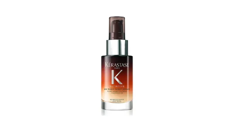 The 8H Magic Night Serum by Kérastase is a highly nourishing overnight solution formulated for dry hair. It uses anti-dryness polymers to offer instant, non-greasy softness, while essential nutrients reinforce and replenish the hair fiber. Over eight hours, the serum rejuvenates and protects the hair, reducing friction from the pillow. Results show hair is 98% stronger. The packaging includes 20% recycled glass.