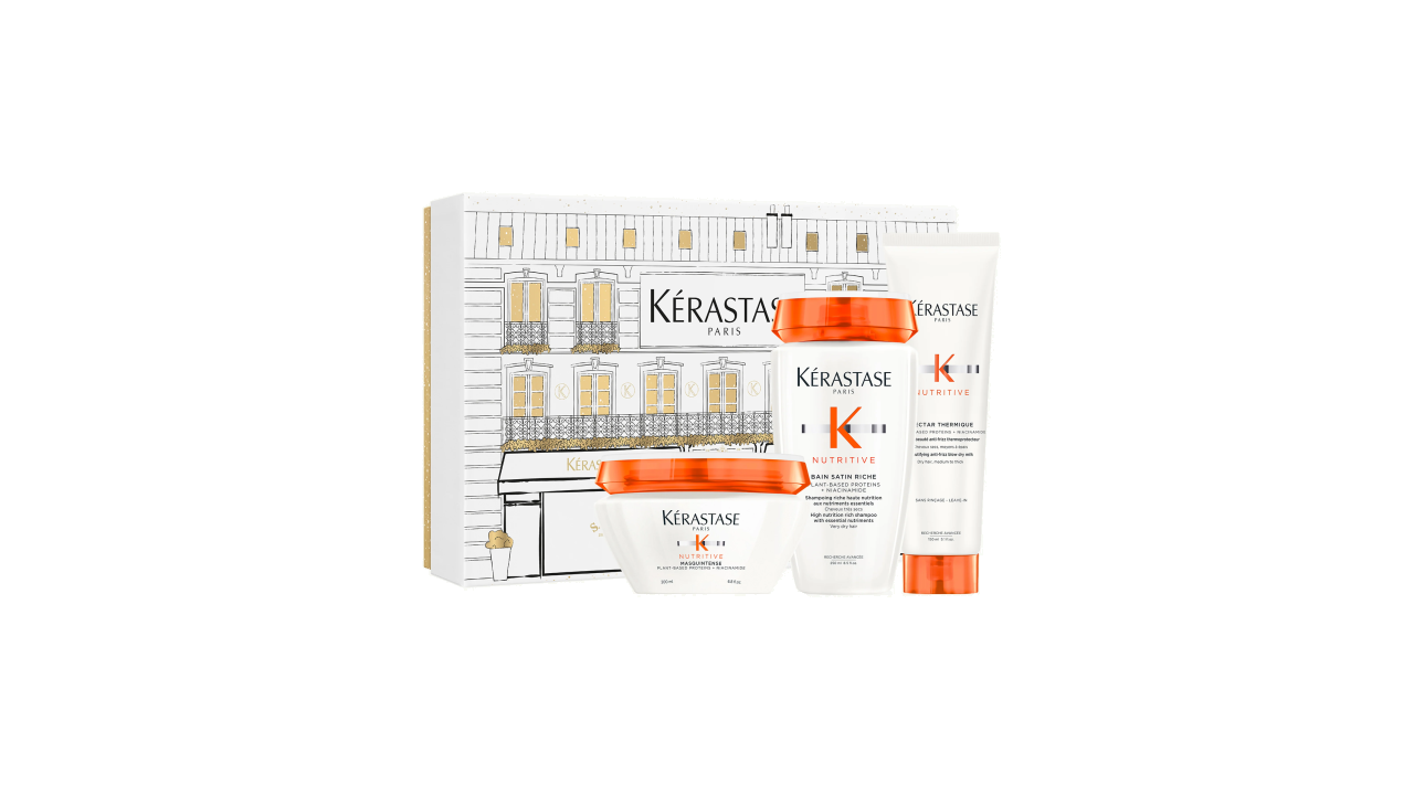 Kérastase Nutritive Limited Edition Gift Set is a premium care set for dry hair, offering complete nourishment from start to finish. It includes the Bain Satin Riche shampoo (250 ml) for deep hydration, the Masquintense mask (200 ml) to intensely nourish lengths and ends, and the Nectar Thermique heat protectant (150 ml) to reduce frizz and shield hair during styling. Enriched with caring ingredients like Iris Root Extract and Royal Jelly Extract, this set leaves the hair softer, shinier, deeply moisturised, and visibly healthier. An ideal treat for yourself or a thoughtful gift for anyone who loves well-cared-for hair.