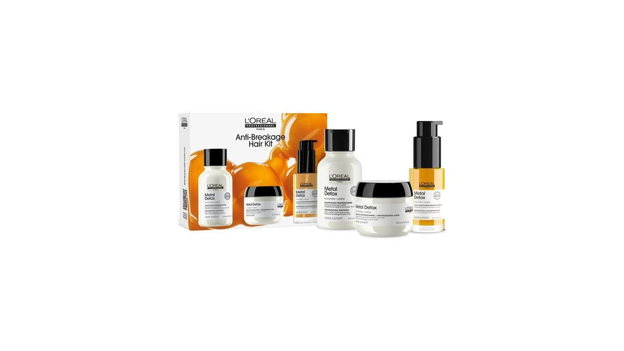 The L’Oréal Professionnel Serie Expert Metal Detox Anti‑Breakage Mini Trio Kit is a professional‑grade hair care set designed to protect, detoxify and strengthen weak, brittle or colour‑treated hair by targeting internal sources of breakage — including metal particles that can accumulate from water and styling. Enriched with Glicoamine, an advanced molecule that penetrates deep into the hair fibre to neutralise metal build‑up and help prevent breakage, this three‑step regimen combines an anti‑metal detox shampoo, a nourishing protective mask and a lightweight concentrated oil to detoxify, smooth and reinforce the hair from roots to ends for noticeably stronger, softer and shinier results.