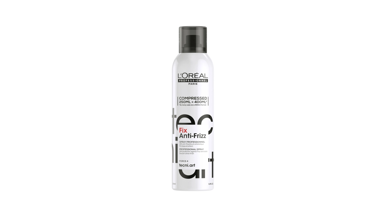 L’Oréal Professionnel Tecni Art Fix Anti-Frizz Spray tames flyaways and frizz while protecting against humidity. It delivers a strong, long-lasting hold with a polished, shiny finish for any hairstyle.